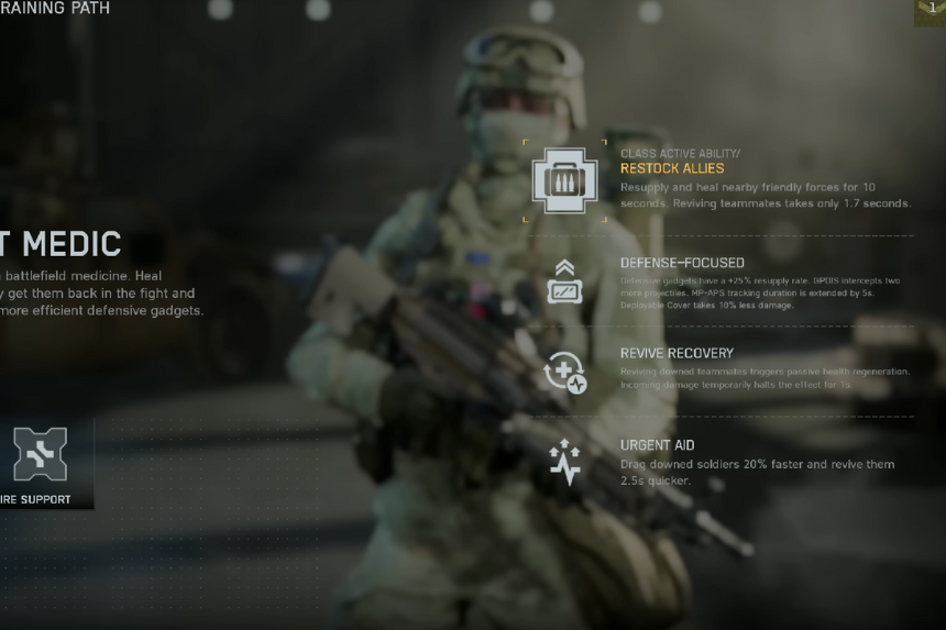 When you start out as a Support, your first Training Path is the Combat Medic. This is the only path available until you reach level 20, and even after that, unlocking the next path requires completing several challenges. So early on, everything you do as a Support will revolve around this Combat Medic role.