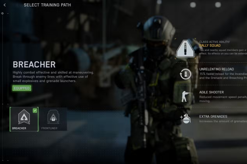 The Breacher path defaults you to explosive firepower for close-range superiority. The Frontliner path is more team-oriented — keeping your teammates alive and pushing forward together under the adrenaline buff.