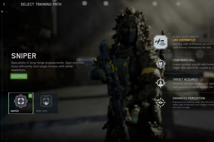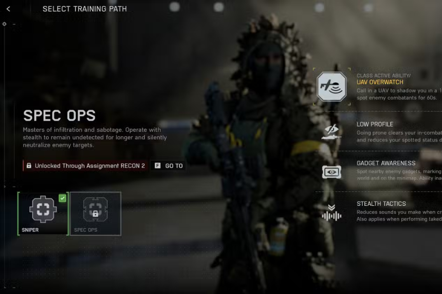 The Sniper route expands your range and spotting skills, turning you into a battlefield scout. The Spec Ops route, on the other hand, sacrifices range for stealth — allowing you to move without noise, tag enemy devices, and remain undetected.