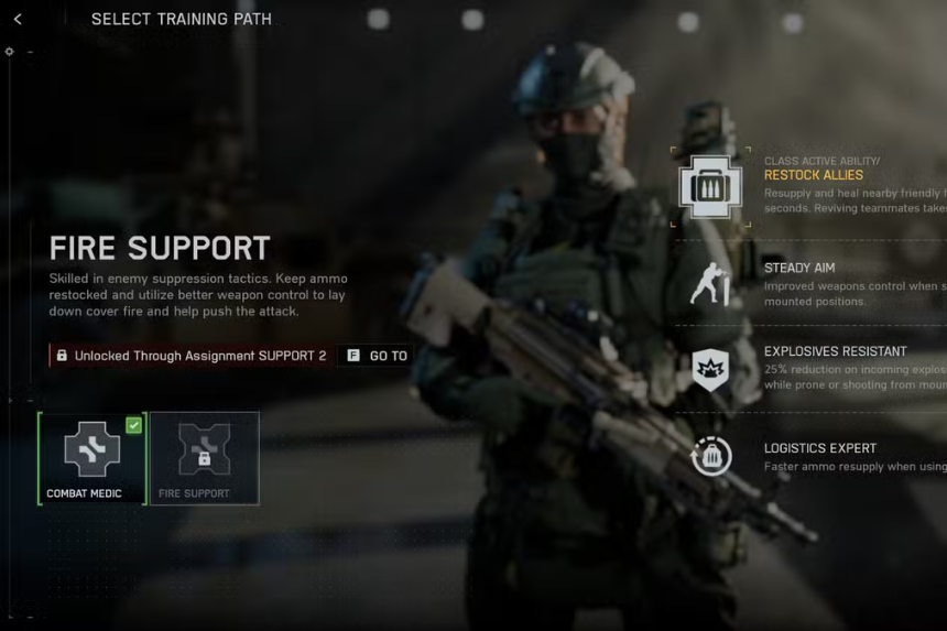 The Combat Medic specialisation goes all-in on high-intensity frontline assistance, whereas Fire Support makes you a defensive behemoth able to keep your team stocked and ready for long firefights.