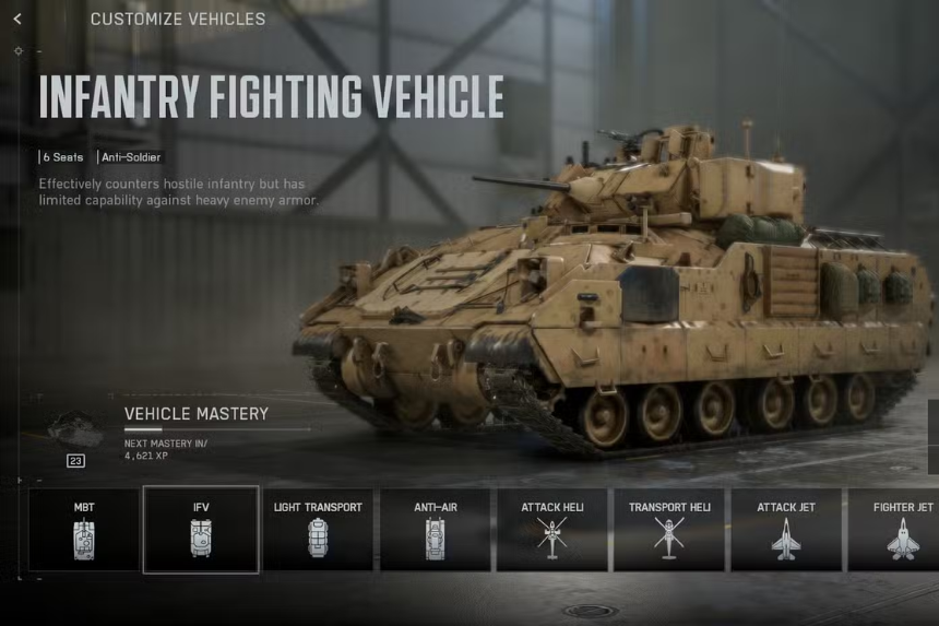 IFVs (Infantry Fighting Vehicles) are your mobile spawn points — quick, versatile, and excellent for supporting squads. They’ll never have the same firepower as tanks, but they excel at mobility-based warfare.