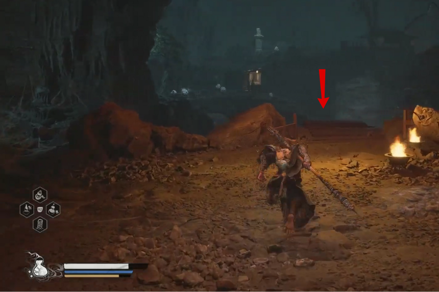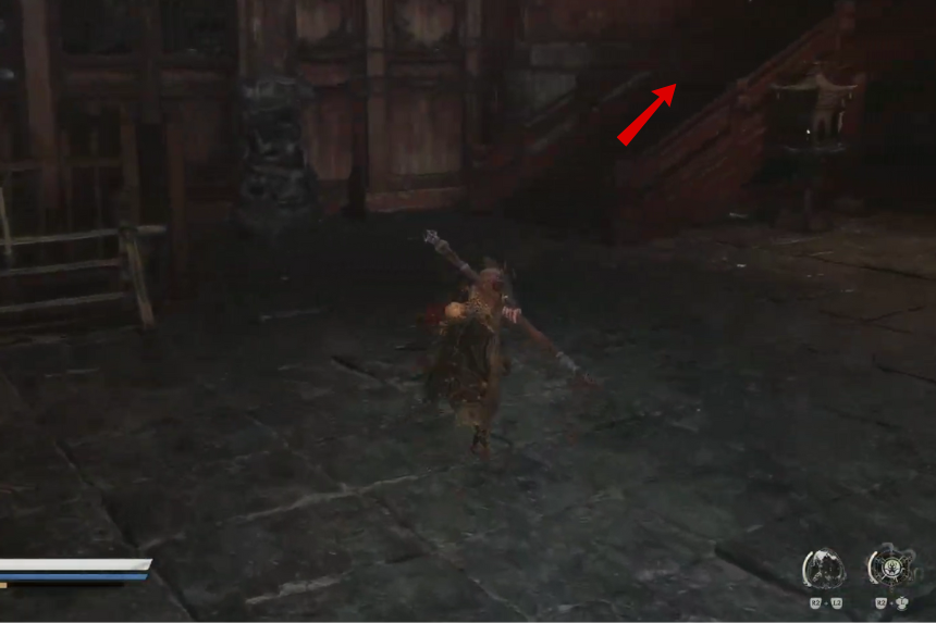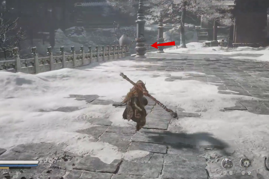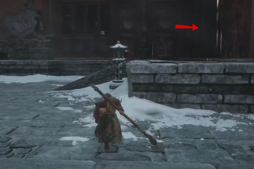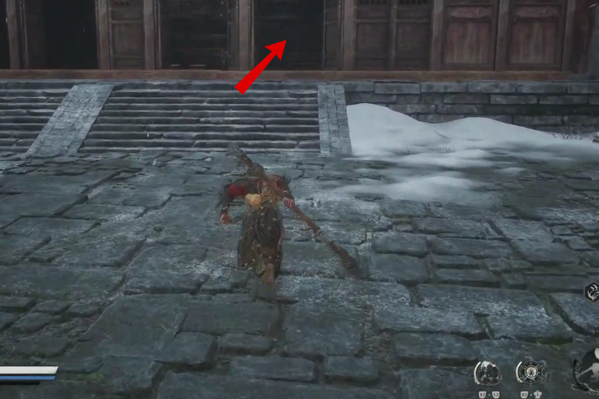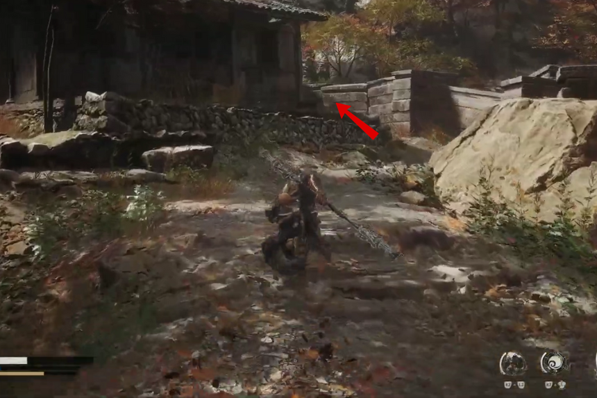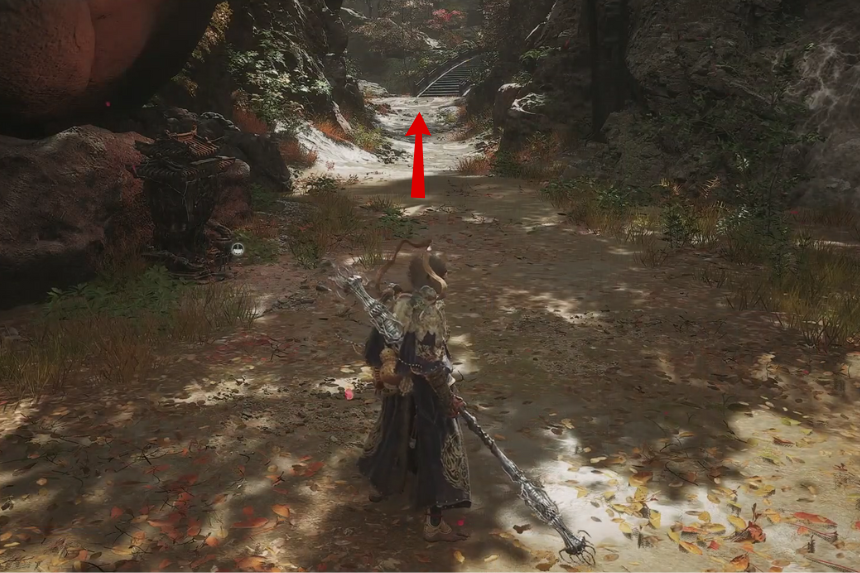 Begin at the New Thunderclap Temple, then go to the Temple Entrance shrine. Walk toward the temple and exit through the opposite side. When you reach the two staircases, take the left one and keep close to the building on your left.