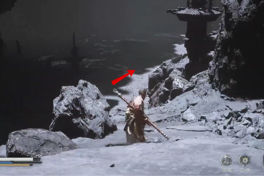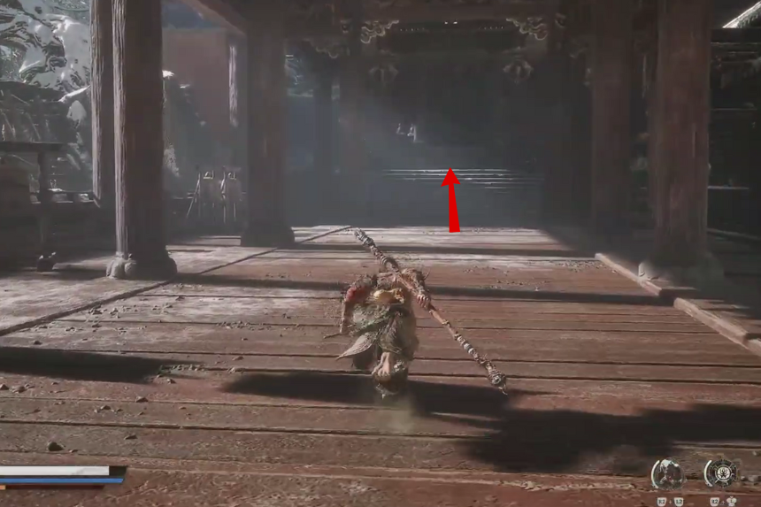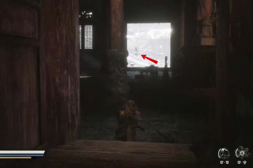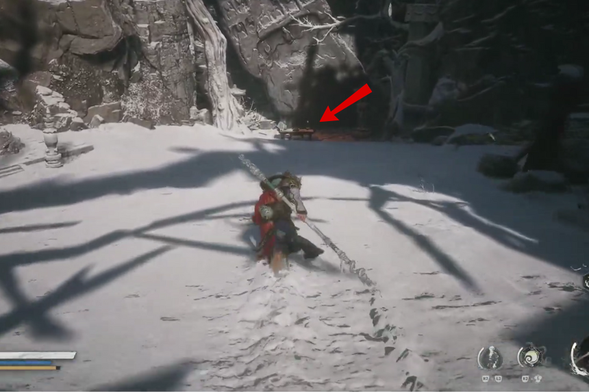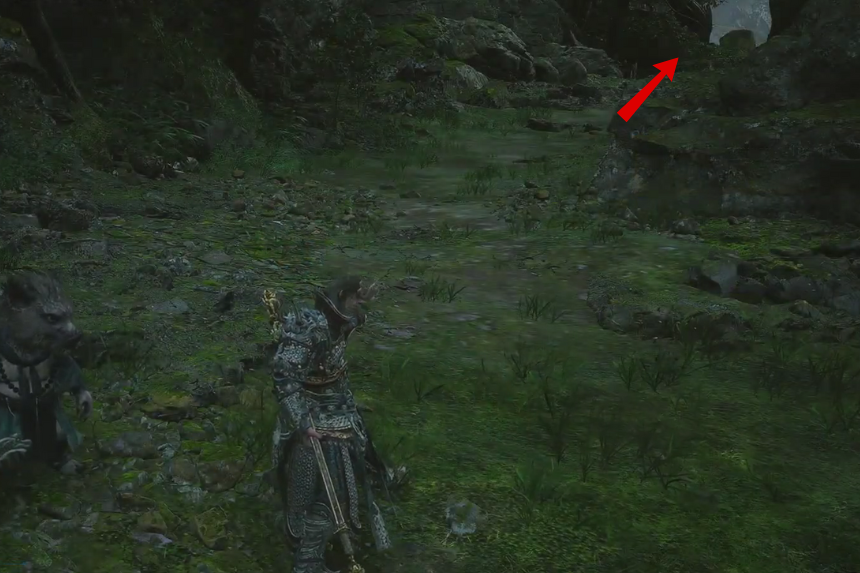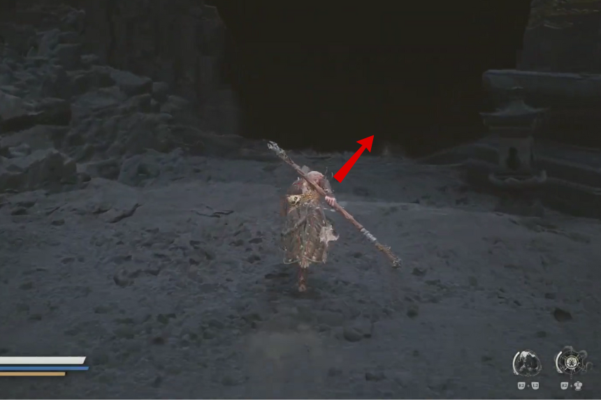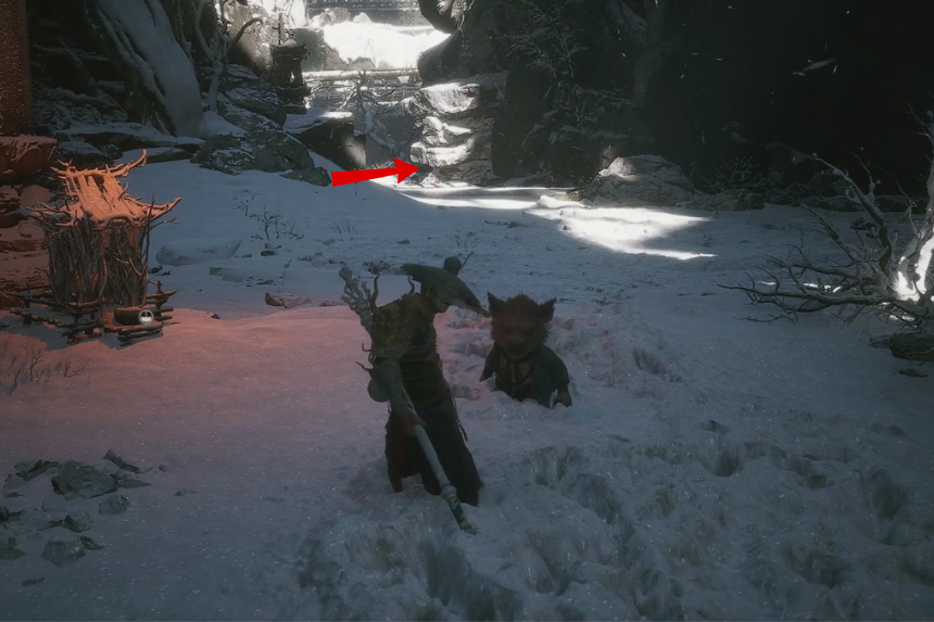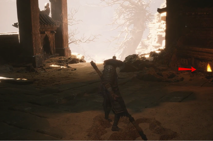 Begin at the New Thunderclap Temple, then go to the Temple Entrance shrine. Walk toward the temple and exit through the opposite side. When you reach the two staircases, take the left one and keep close to the building on your left.
