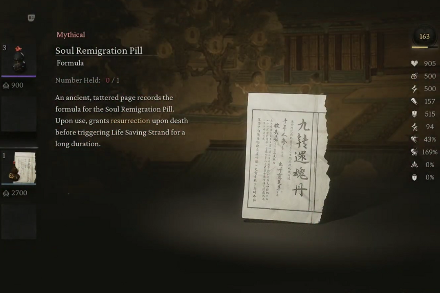 This formula is available only in New Game+, where you can buy it from Xu Dog once again. When you use this, it lets you come back to life if you die, and it stays active for a long time. It basically gives you a free resurrection before your Life Saving Strand would normally kick in.
