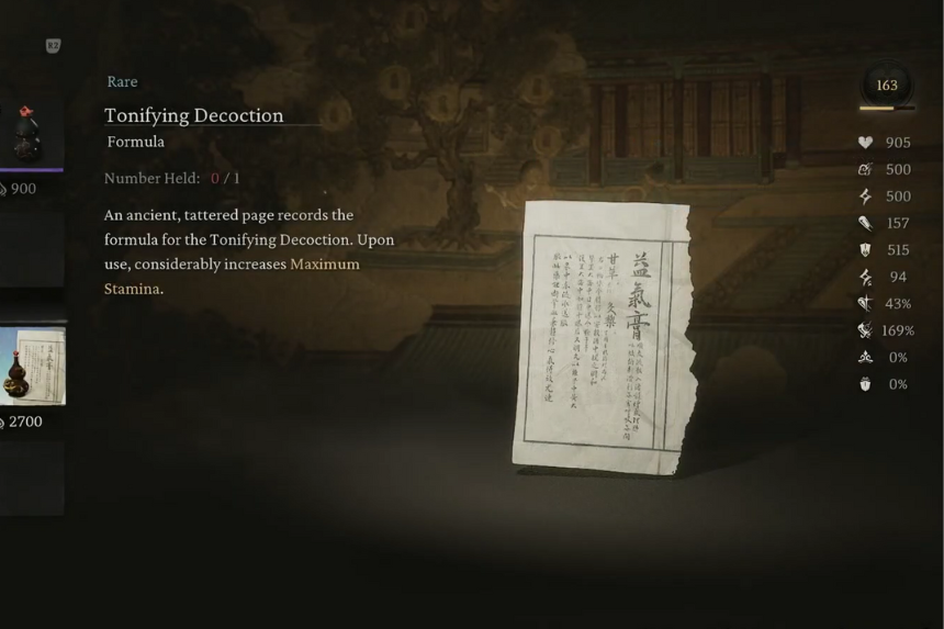 You’ll be able to purchase this formula from Xu Dog after you finish Chapter 2. Check back with him once the chapter is done. In Chapter Three, you gain access to the Tonifying Decoction. This one helps your stamina come back faster, making it easier to dodge, and sprint.