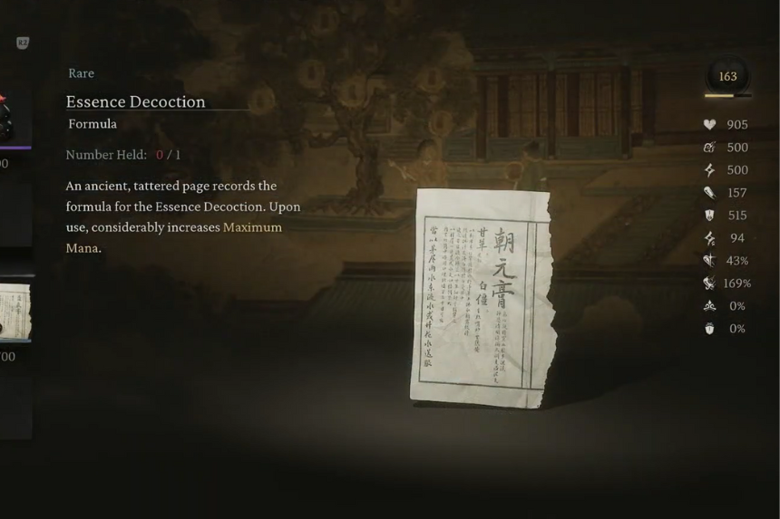 This formula becomes available from Xu Dog after you finish Chapter 3. Just visit him again to buy it. By Chapter Four, you’ll be able to use the Essence Decoction. It increases your focus regeneration, which is perfect if you like casting spells one after another without waiting too long between them.