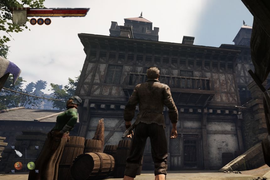 To start Chad’s Order Attire Quest, reach the port, and there you will find an option to join the Order or Free Hunters. From the port, take the right towards the wooden bridge. Exit through the gate and walk straight ahead. Now, cross the stone bridge and on the left you will find the Order headquarters. Head inside the headquarters and speak with Gabriel.