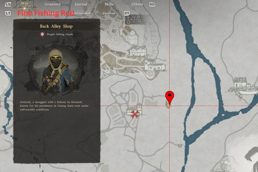 To get the Fine Fishing Rod, visit the Back Alley Shop and speak with Grimrak. He sells the Fine Fishing Rod blueprint for 10 Silver. Once you have the blueprint, take it to the Blacksmith and bring the required materials: 10 Fine Timber, 10 Iron Ore, 3 Thick Hide, and 10 Feathers. After that, the Blacksmith can craft the rod for you.