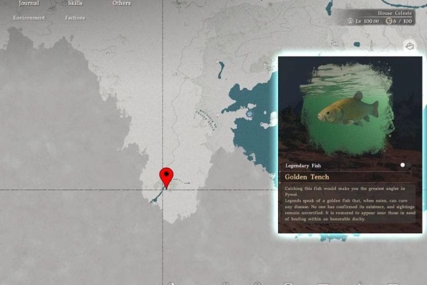 Golden Tench can be found on the southwestern edge of the map. Look for the water body opposite the Mountain of Frozen Souls.