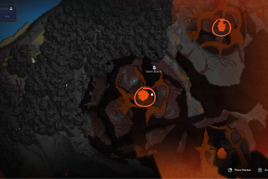 What you’ll need to do is place a battery at the top of a volcano to make sure that if you die underground, you can respawn at the volcano and quickly return to the caves. Next, jump directly into the volcano while keeping your daggers equipped. Use your daggers for charged attack and dash out of the lava. Eating some food afterward should help stabilize your health.