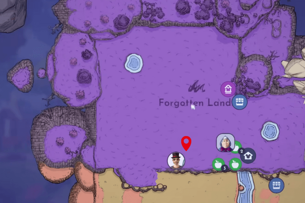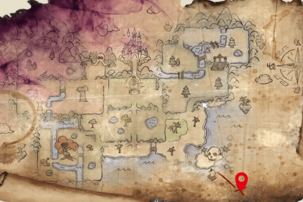 After collecting that, your next goal is to find and open the Captain’s Chest. If you haven’t already, head back to where The Forgotten is standing. There is a silver key on the ground if you look close to them (and Peter Pan’s shadow). Pick it up and use it to enter the pirate ship’s quarters. There is a chest with a treasure map inside. After picking it up, go back to The Forgotten and inform them of your findings.