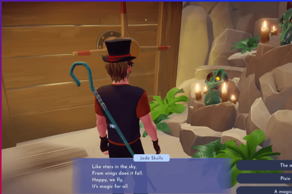 Once Peter Pan shows up, he’ll tease you a bit saying you seem like a grown-up who’s forgotten how to have fun. To prove him wrong, you agree to play a game of hide-and-seek. Of course, in true Peter Pan fashion, he picks the darkest, spookiest place in Dreamlight Valley to hide. You can either follow the trail of Pixie Dust on the ground to track him down, or ask a few villagers for hints. Just head straight to the Dark Castle that’s where Peter Pan is hiding.