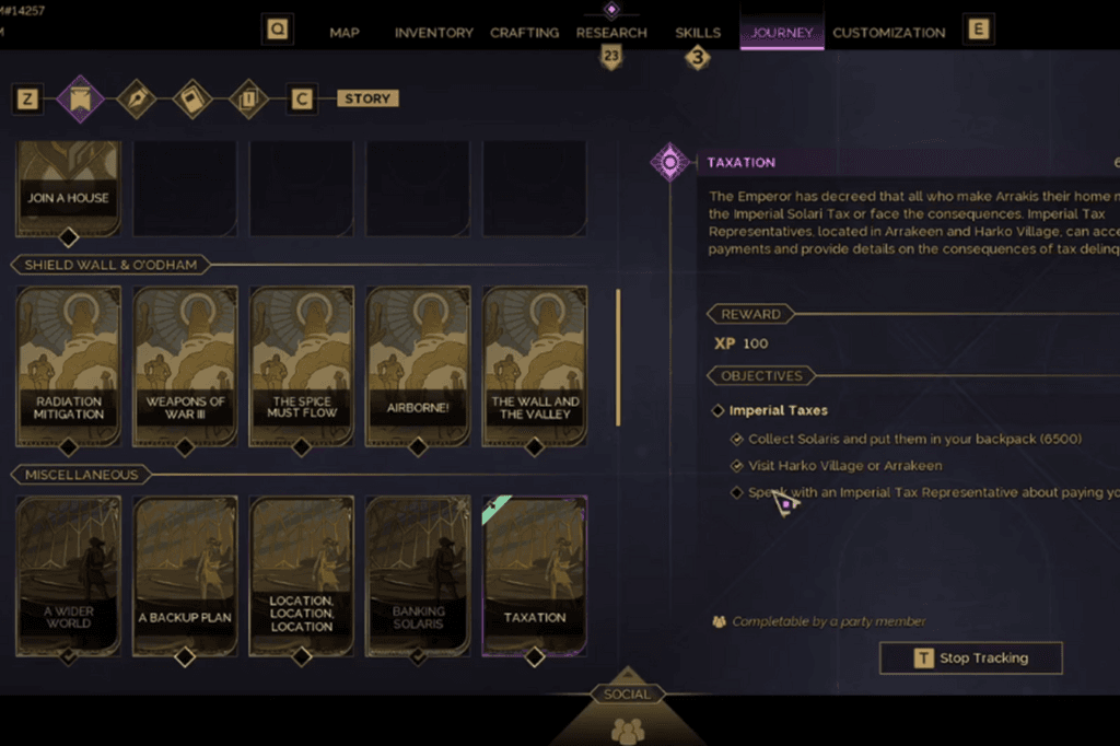 You can start the Taxation side quest straight from your in-game menu. Just open the menu, go to the Journey tab, and scroll down to the Miscellaneous section. You’ll find a quest there called “Taxation.” To start the quest, make sure you’ve got at least 6,500 Solaris in your backpack that’s all you need to begin.