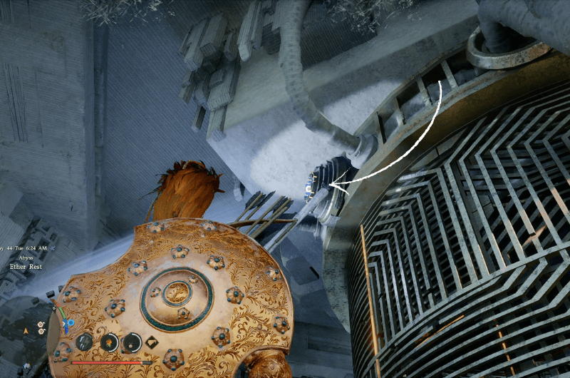 Once you’re in the chamber, look for the above pointed button, use the Axiom Force on the button and you should be able to control the pillar and turn it until there’s an opening to enter inside and there’s a fan in there, use it to go to the upper level.