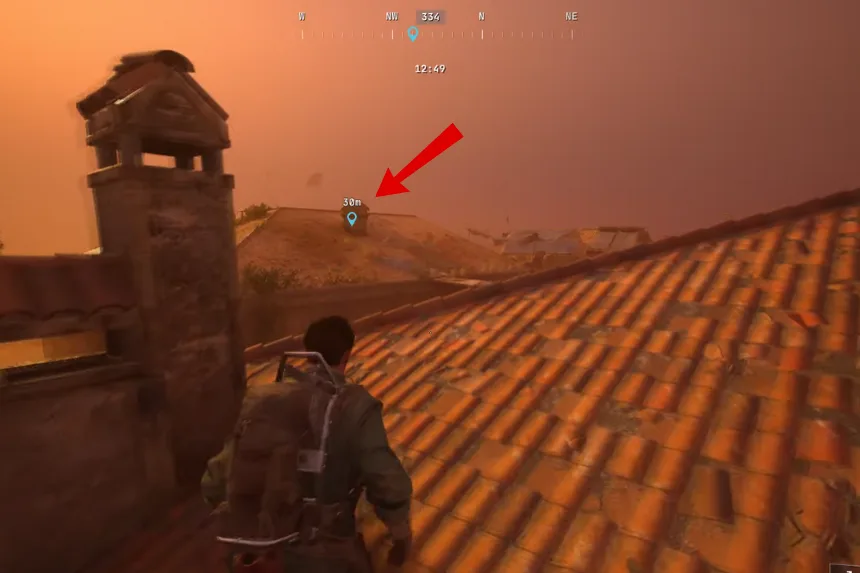 You can reach the terrace by climbing across the rooftops of nearby buildings from either the east or west side. Be cautious while moving through the area, as there are patrolling Arc machines. Use the available cover to sneak past them safely.