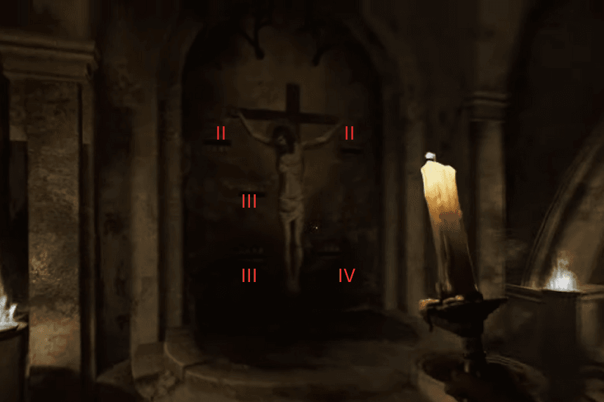 - Objective: Solve the Five Sacred Wounds puzzle to unlock a secret passage.