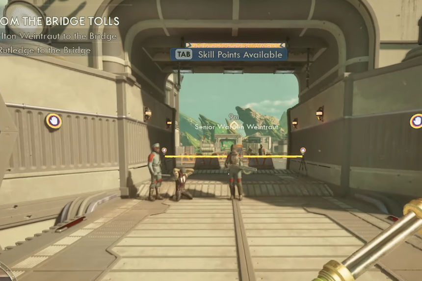 For Whom the Bridge Tolls is one of the quests on Paradise Island in The Outer Worlds 2. The mission centres around the main bridge that connects the southern and northern halves of the island, a crossing point held tightly by the Protectorate. To get through, you will have to strike a deal with Warden Weidtraut. In this guide, we will walk you through how to complete for whom the Bridge Tolls quest.