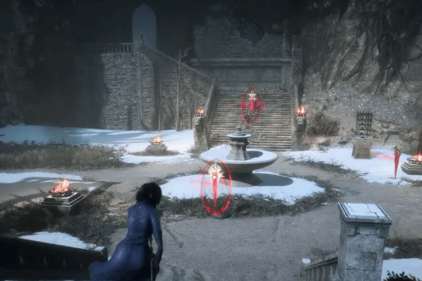 You’ll need to solve a statue puzzle in the courtyard to free the wisp. You’ll need to turn the statues to face specific braziers. There are three rotatable statues to find: one in the northern corner of the grounds, another in the eastern corner, and a third near a staircase in the center.