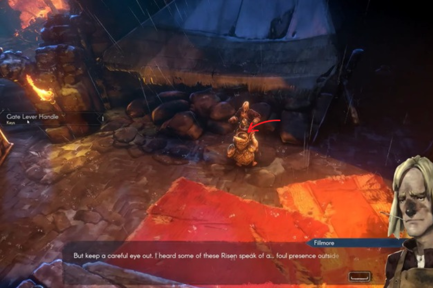 After you enter the Mess Hall, speak with Fillmore, and he will give you the Gate Lever Handle after a quick conversation. The Gate Lever Handle is automatically added to your inventory. You will need to use this Handle to open up the main gate to continue your travels toward Sacrament through the Orban Glades to your east.