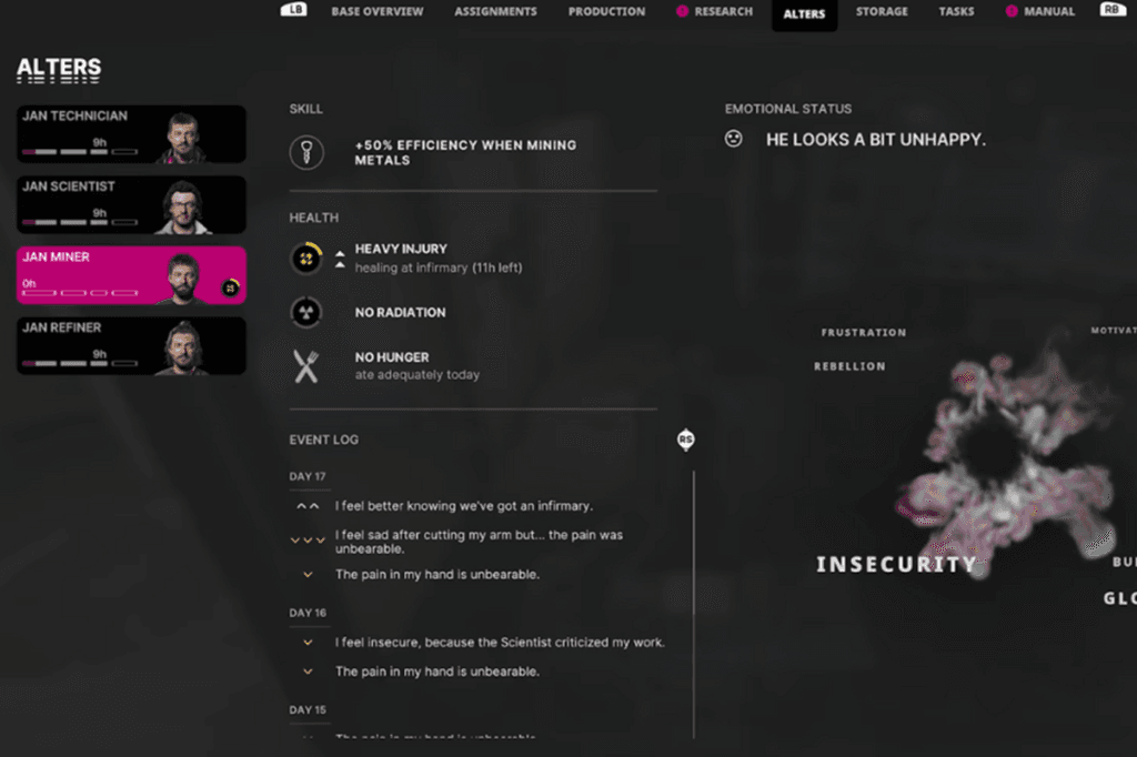 If you decide to add the Jan Miner Alter to your team in The Alters, you’ll soon notice he’s dealing with some serious psychological issues. After a while, he’ll start asking for more medication to cope with intense phantom pain. He can manage for a little while, but eventually, things will get worse he may even have an accident. If you don’t step in, he could end up dying from one, no matter what job you give him.