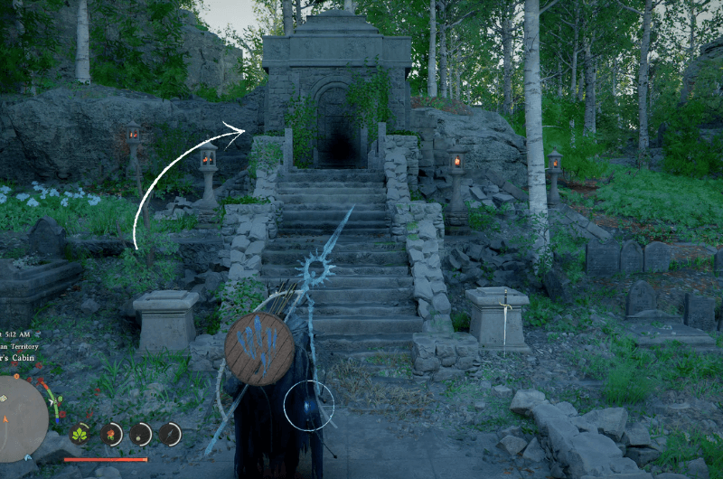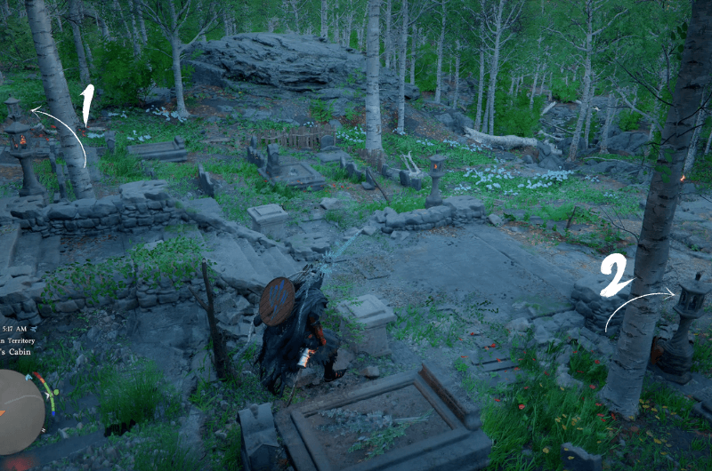 Before we head to the treasure’s location, since you are at the hunter’s cabin you might want to collect the Abyss Artifact that you can use to upgrade skills. The artifact however, is locked behind the cabin’s door. To open the cabin’s door, light up the two unlit spires around the cabin. Now, for me it was just two spires, it could be different for you or maybe not. Nevertheless, light up all the unlit spires that are present in the graveyard around the hunter’s cabin.