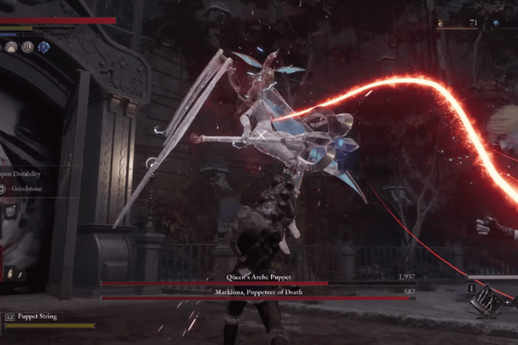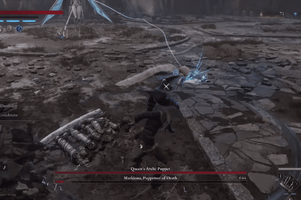 This fight always kicks off the same way the puppet charges straight at you the moment it begins. Step forward, hold your ground, and parry the red-charged rush attack to start strong. From there, focus most of your attacks on the puppet, and only go after Markiona when she’s standing still or casting spells from a distance. Be ready for their “Switch” move, where they suddenly swap places it can catch you off guard.
