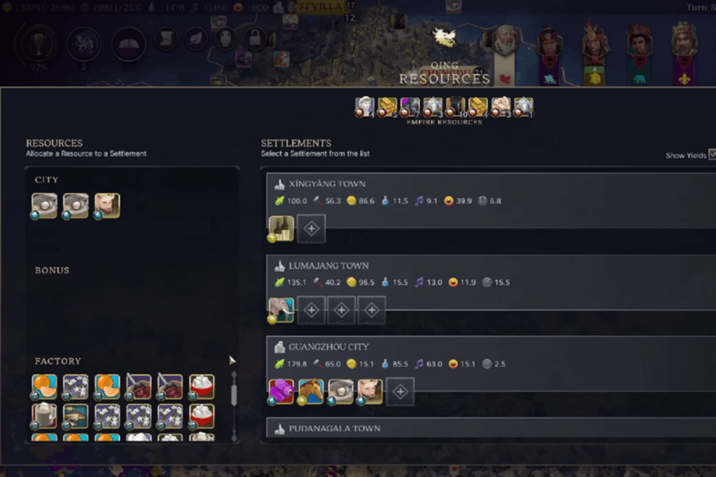 In the Resources menu, you choose which Factory Resource you want to assign to that specific city. You’ll see the chosen resource appear in the Resources bar and also next to the Factory icon for that city, so you can easily see what each factory is producing. Each city can only specialize in one Factory Resource at a time. However, you can assign multiple units of that resource to the city to boost its production bonuses.