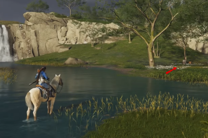 After that, cook a fish. While you are eating it, a Settler dressed in white will show up and talk about someone called the Smiling Yoshitomo, who turns out to be your bounty target. Take him down. The battle isn’t too tough, but his quick attacks can catch you off guard if you’re not careful. The best way to handle him is by using Heavy Attacks to break through his guard. Keep this up until he goes down.