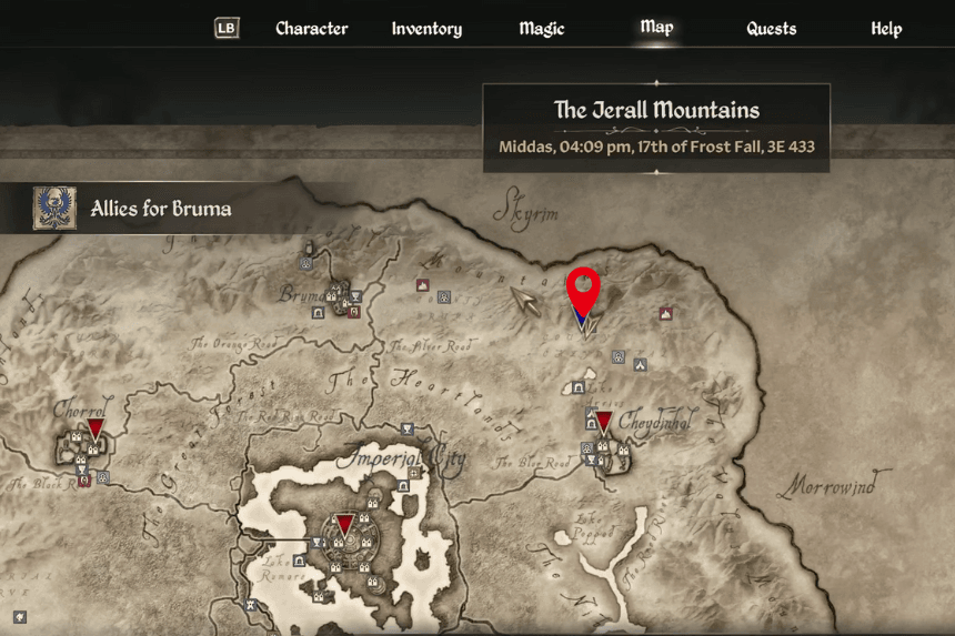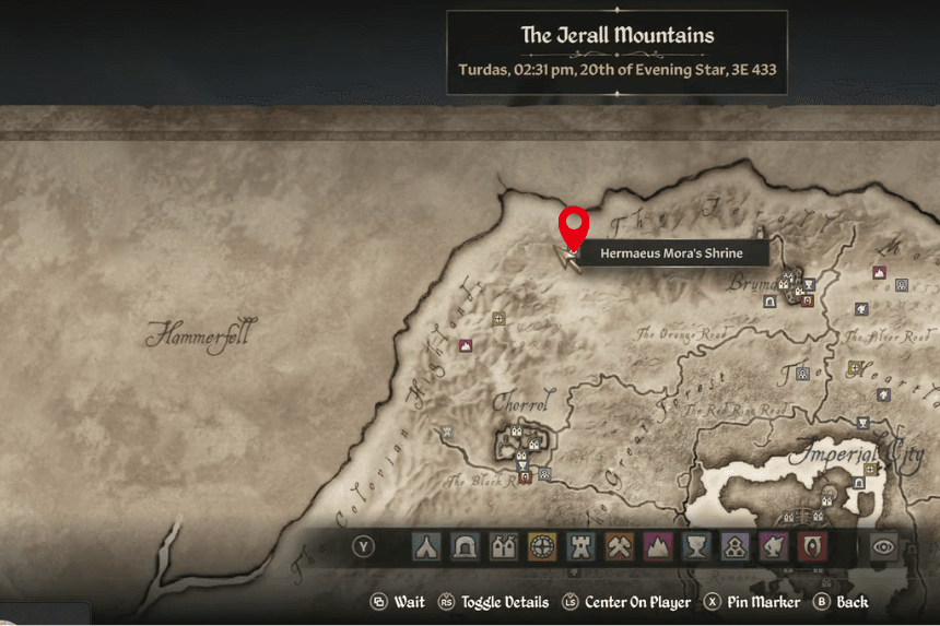 Hermaeus Mora’s Shrine is located in the far northwest mountains, beyond Bruma, making it one of the hardest Daedric shrines to find. It’s perched atop snowy peaks, so you’ll need to head west from Bruma and cross some wooden hanging bridges to reach it.