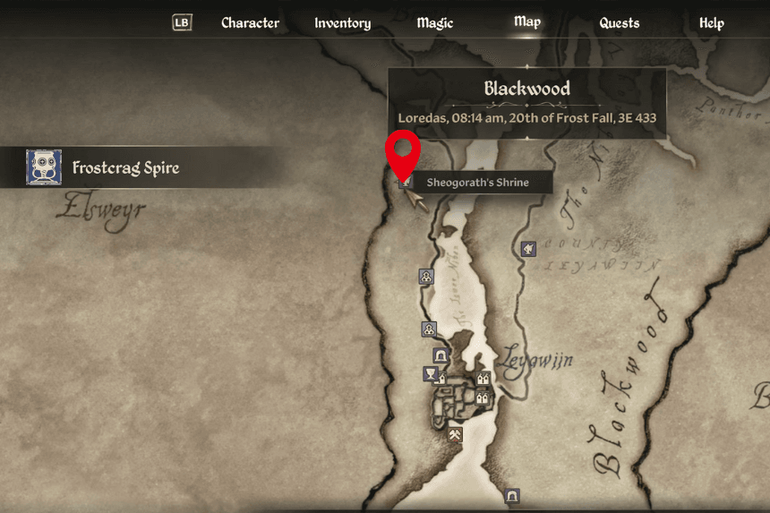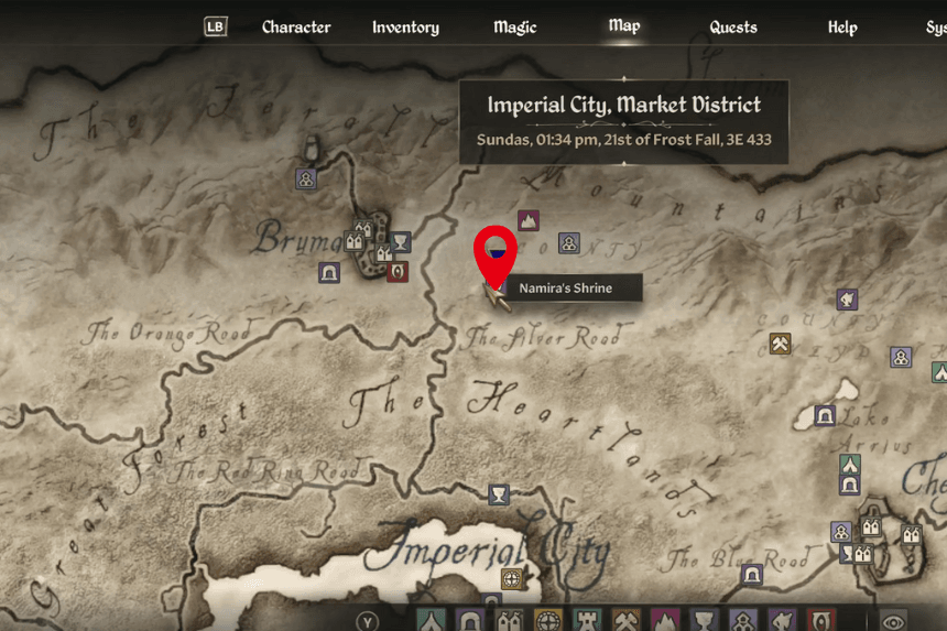 Namira’s Shrine is located in the northern part of the map, just east of Bruma. Unlike most other shrines, you don’t need to bring an offering. Namira only accepts worship from those she finds “unattractive,” which means your Personality stat needs to be 20 or lower to start the quest.