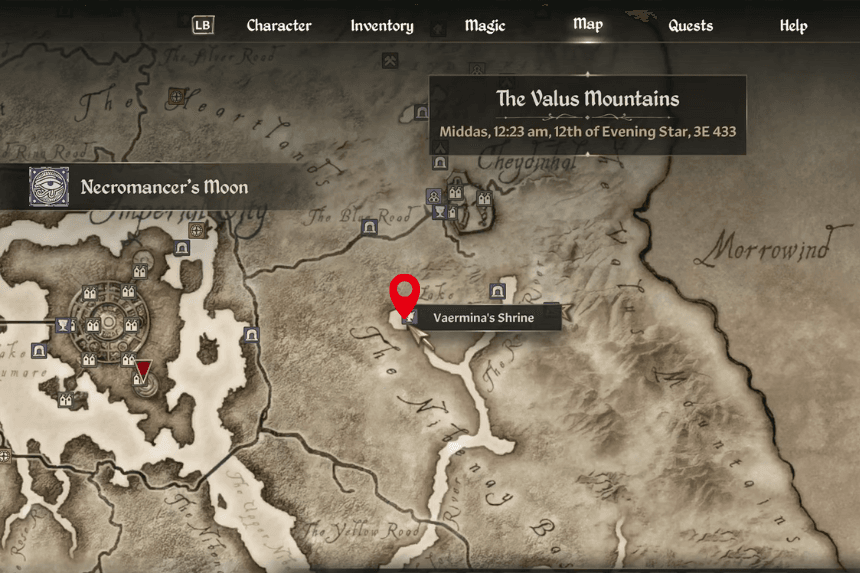 Vaermina’s Shrine is located right next to Lake Poppad, just southwest of Cheydinhal. Finding the shrine is easy, but starting her quest can be hard because it requires a rare item, a Black Soul Gem. Once you have the gem, Vaermina will send you on a quest to Arkved’s Tower, which lies to the south. The tower is a large, challenging dungeon, so be prepared for a tough fight. Make your way through until you reach the Death Chamber, where you’ll find Vaermina’s Orb on a table. Pick it up and head back to the shrine. Completing the quest earns you a powerful reward: the Skull of Corruption. Just make sure you’re at least level 5 before starting.