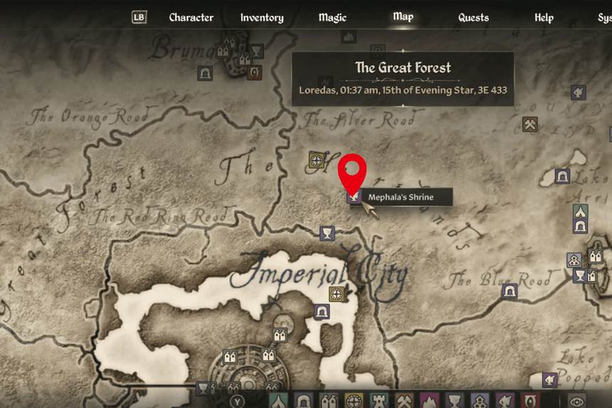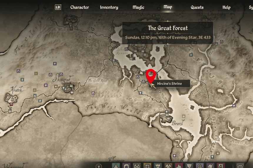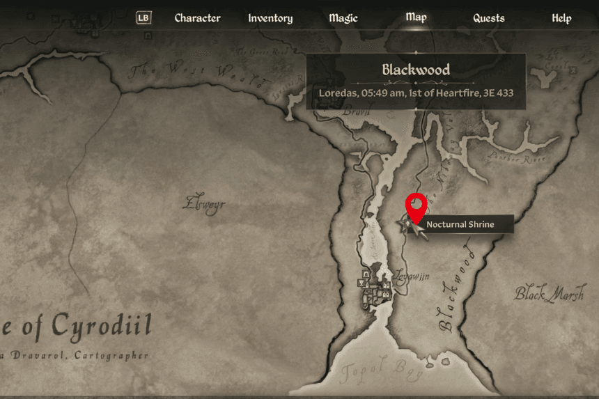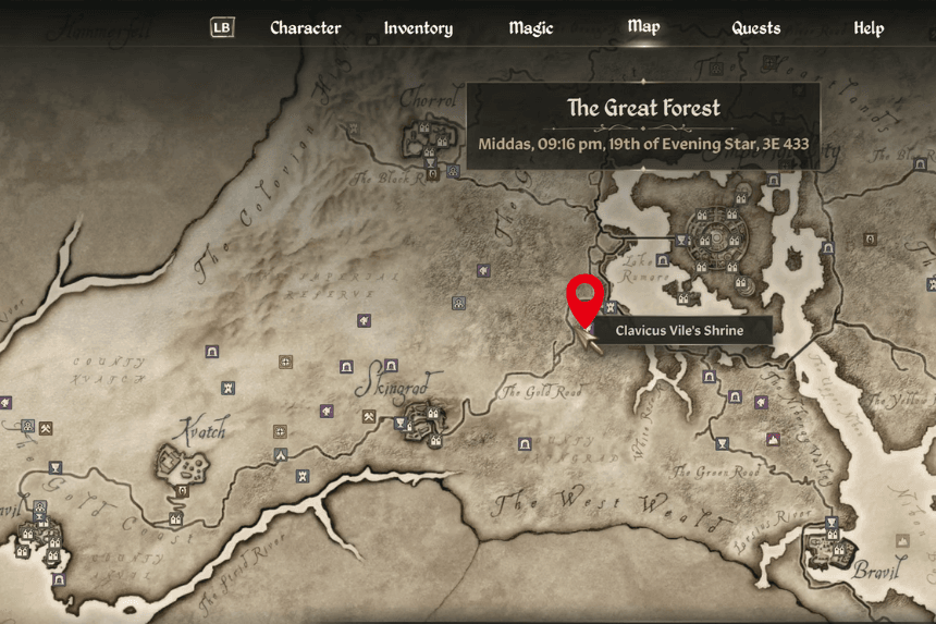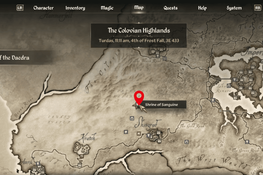 Sanguine’s Shrine is located in the forest, far west of the Imperial City and just a bit north of Skingrad. You’ll find it southeast of Fort Dirich and southwest of Elenglynn. To start Sanguine’s quest, make sure to bring a bottle of Cyrodilic Brandy as an offering. The quest takes you to Castle Leyawiin, way down at the southern end of the map.