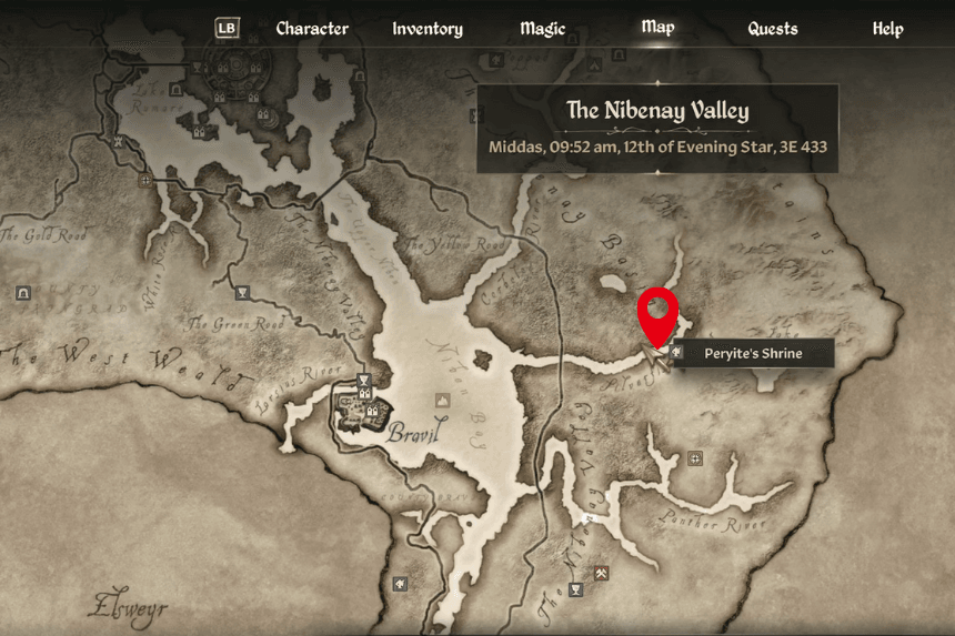 Peryite’s Shrine is located on the eastern side of the map, just northwest of Lake Canulus and right beside the Silverfish River. Unlike most other Daedric quests, you don’t need to bring any offering to begin just speak to the shrine to start.