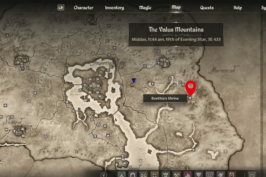 Boethiah’s Shrine is located far to the east of the Imperial City, at the edge of the map between Fort Naso and Fort Facian, roughly in line with the Arcane University. It’s perched high up on a mountain, though not all the way at the top. To start the quest, you’ll need to offer a Daedra Heart at the shrine.