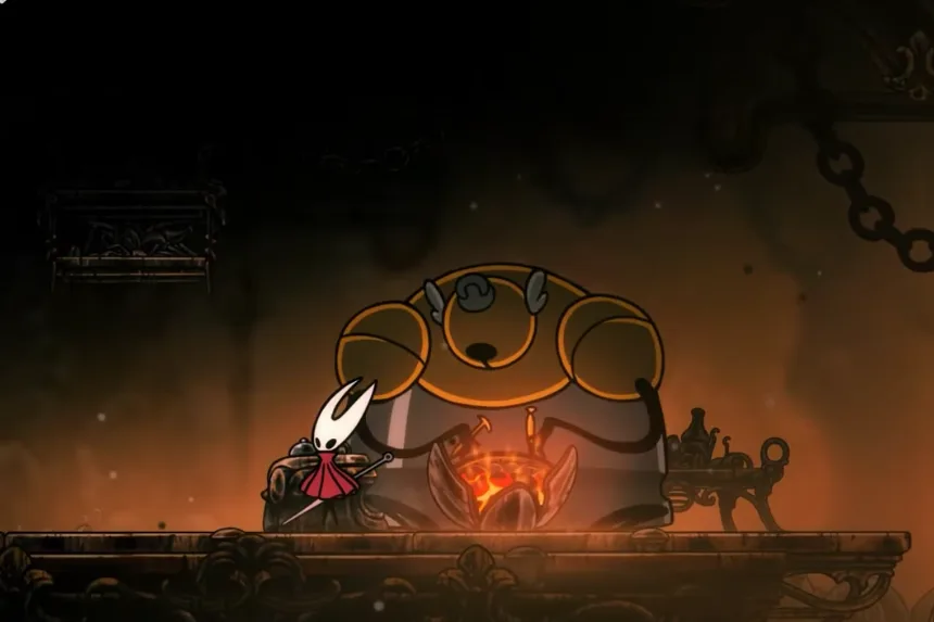 You can craft this with the Forge Daughter in the Deep Docks, using 1 Craftmetal and 110 Rosaries. It’s a sturdy iron bell designed to protect Hornet from the extreme heat, reducing the damage she takes from fire and magma while exploring the area.
