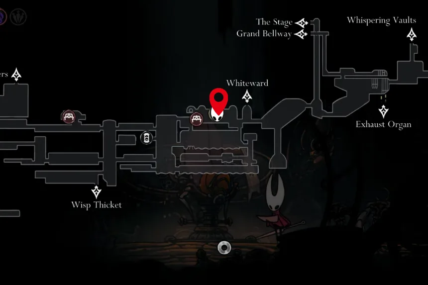 In Whiteward, near the end of the area, jump onto a ledge just above Hornet and you will spot it sparkling. Picking it up lets Hornet bind faster, meaning she can heal more quickly in the middle of combat.