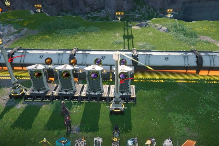 Once a Shredding Unit is in position, connect it with an appropriate unloader for your depot via a conveyor belt to the very shredding unit that feeds into it. One electric pylon should be installed to the left and one to the right of the Shredding Unit. Leave at least a one block gap open on the right side of your Shredding Unit for correct alignment.