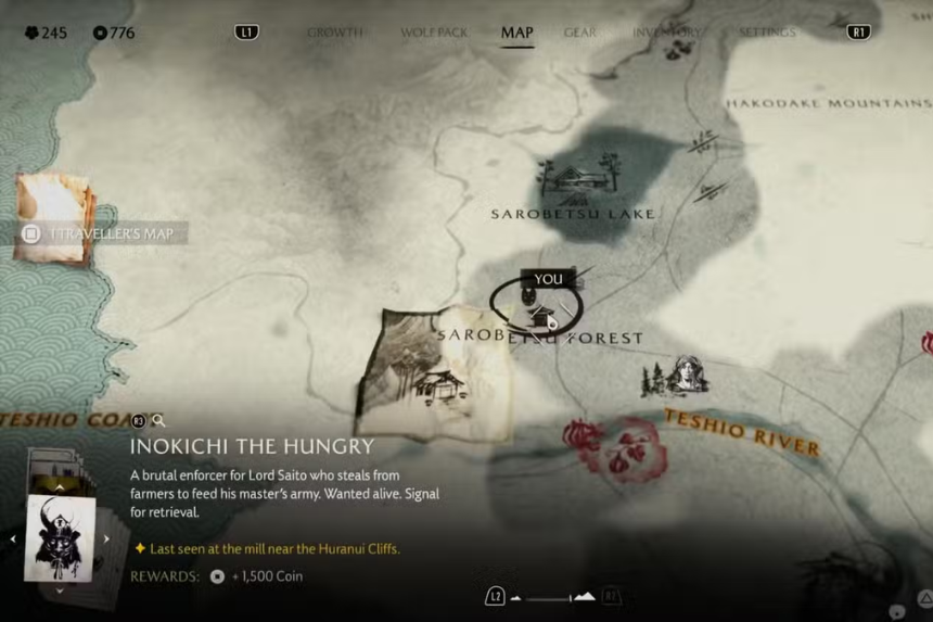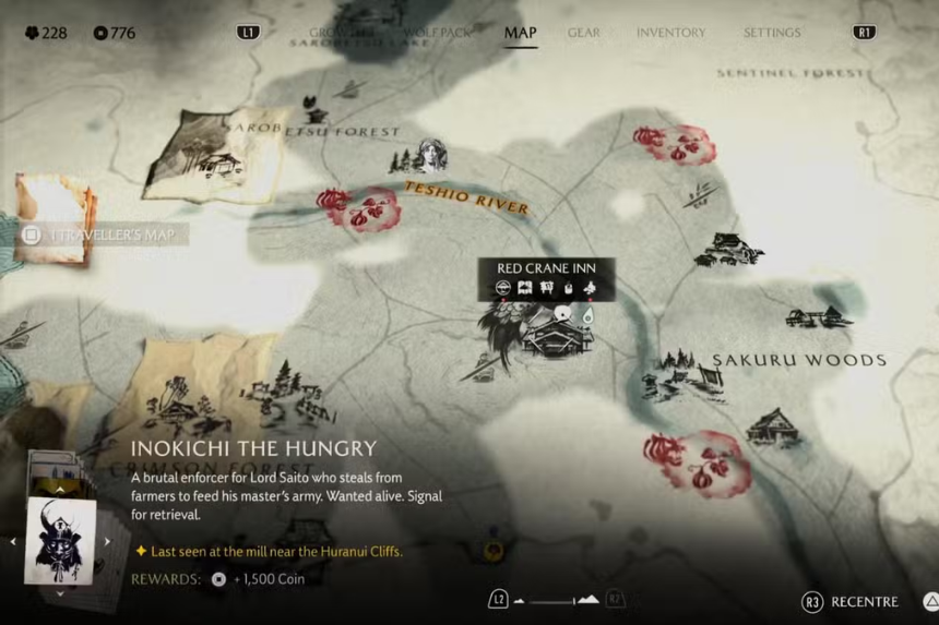 After the first part in Teshio Ridge with the Kitsune fight, your map will indicate the two major points: the Red Crane Inn (as part of the main story) and Owl Mountain (for Kusarigama). Get to the Red Crane Inn first. You don’t need to start the story there—you just need to open it up as a quick travel location to make the commute much easier.