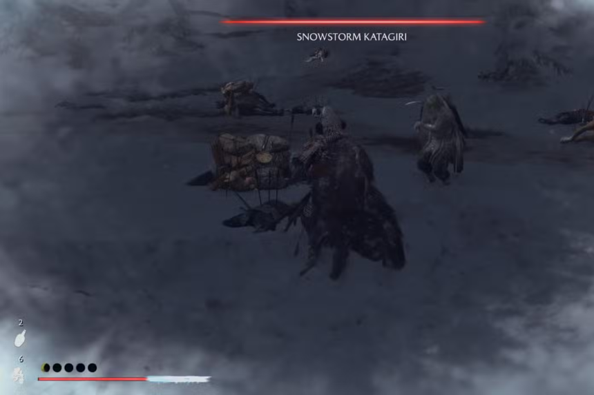- Move north a little further to reach Sarobetsu Lake. You’ll see a group of enemies around a number of corpses, including the target for a bounty, Snowstorm Katagiri.