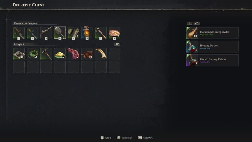 Finding the Traveller’s second chest provides some of the best rewards this early in the game. You get 10 x Homemade Gunpowder, 5 x Healing Potion, and 5 x Great Healing Potion.