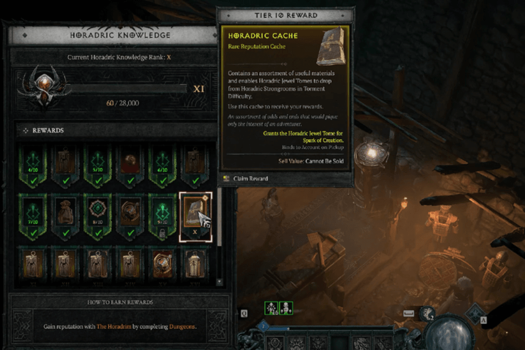 In Diablo 4 Season 9, you can get Horadric Tomes as a drop during different activities, but there’s a catch. Before these tomes can start dropping, you first need to unlock them. To do that, you’ll have to reach Horadric Knowledge Rank 10. Hitting Rank 10 rewards you with a Horadric Cache, and from then on, tomes can drop during your adventures. By completing the Seasonal Questline and engaging in various activities, you can increase your Horadric Knowledge. You can level it up by doing things like defeating Elite opponents, finishing Strongrooms, and navigating through Nightmare Dungeons.