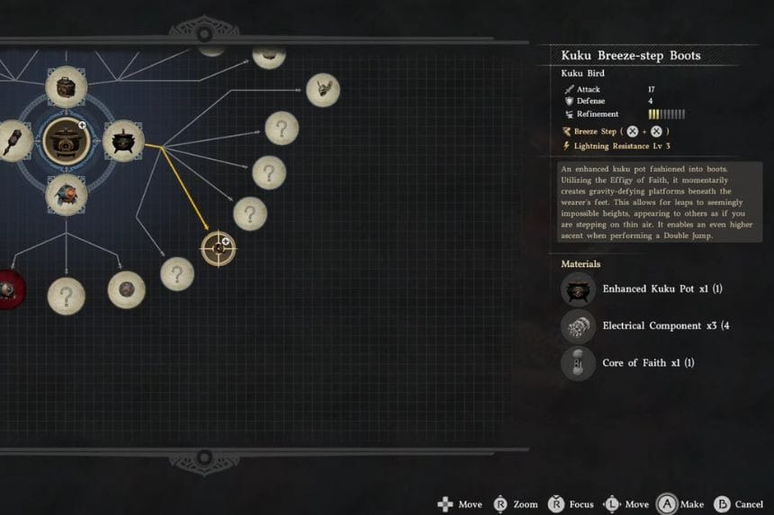 The Kuku Breeze-Step Boots are upgraded from the enhanced Kuku pot and let you create temporary platforms in the air using the Effigy of Faith. In simple terms, they give you extra support under your feet for a moment, making it feel like you are stepping on air. This helps you reach places that would normally be too high, and if you use them during a Double Jump, you can climb even higher.