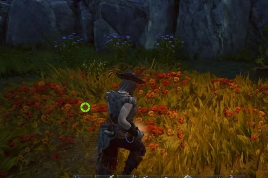 Head south from your starting point. As soon as you reach the area, you need to be on the lookout for any blue plants, preferably those that grow at higher altitudes. There are several of them present in the area, so take some time exploring before you see them. Be careful while gathering, though, since there are enemies around in this region. You need to find blue flowers upon reaching the area. These are the plants that give Flax Fibre. They’re quite common across the island, especially in higher ground areas, so you can gather a lot in a short time.