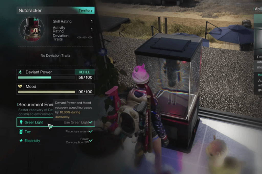 After you’ve captured the Nutcracker Deviant, you’ll need to store it in an Isolated Securement Unit at your base before its abilities will work. While it’s active and guarding your territory, its Deviant Power will slowly drain. It will automatically attack any enemies that come close, keeping your territory safe so you can stay there without worry.