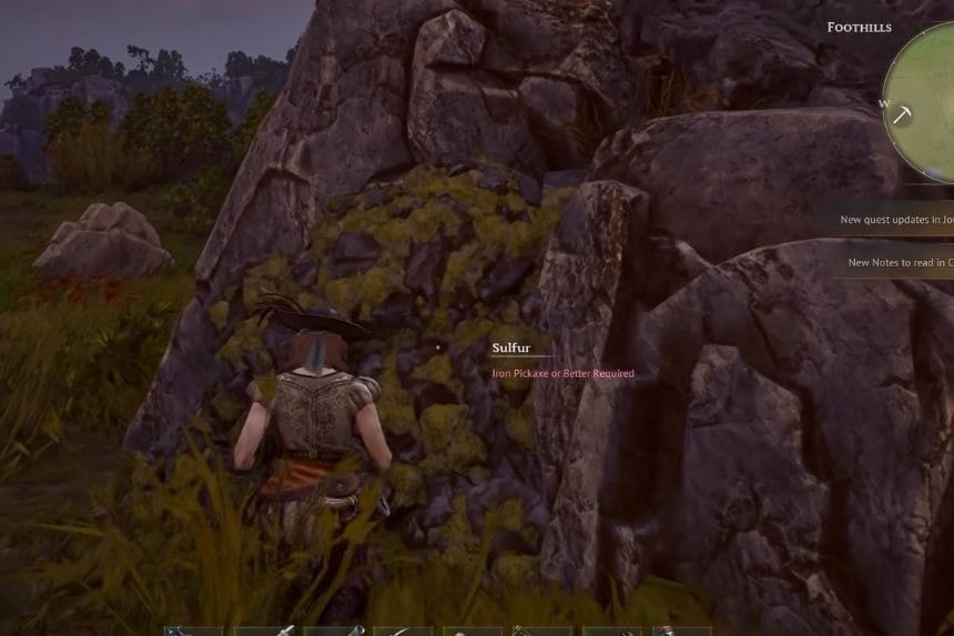 In Windrose, sulfur can be extracted through mining of the yellow sulfur nodes that spawn in the Coastal Jungle and Foothills biomes, by using an Iron Pickaxe for its extraction. However, the best way to get it is by exploring these areas after unlocking the Foothills location, or by looting pirate camps.
