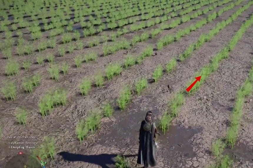 Start from a nearby shed and walk toward the rows of crops. You need to reach six rows into the field from the pathway. Having reached the six-row mark, walk along it, and then you will be able to notice a rapier among the crops. Once you find it, equip your mask, grab the weapon, and leave the area quickly to avoid getting caught.
