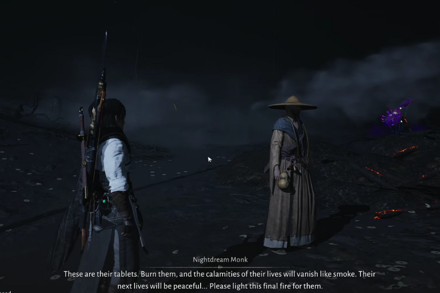 After you have gone through the other side, have a conversation with the monk. He will point you in the direction of the memorial tablet, and the spirits will show you the way. Move together with them until you get to that point. Then you need to light the tablet. The monk will share a few thoughts about the souls finally finding peace, and the quest will be completed.