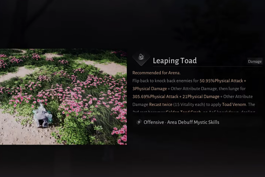 Leaping Toad is an offensive Mystic Skill that lets you flip into enemies, knock them back, and hit them hard before moving away. You can use it three times in a row; each recast builds up Toad Venom on your target. On the third use, the move turns into Golden Toad Crash, a big area-smash that knocks enemies to the ground.