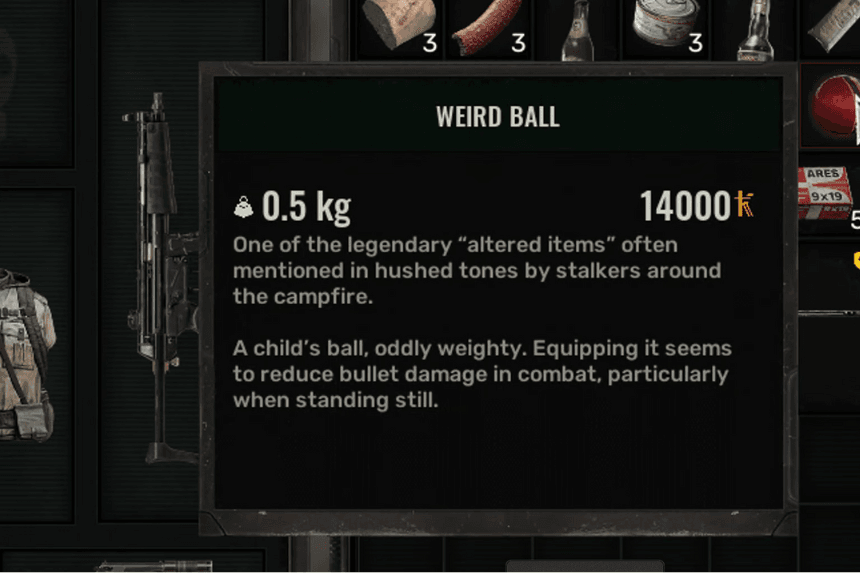 | Description | One of the legendary “altered items” often mentioned in hushed tones by stalkers around the campfire. A child’s ball, oddly weighty. Equipping it seems to reduce bullet damage in combat, particularly when standing still. |