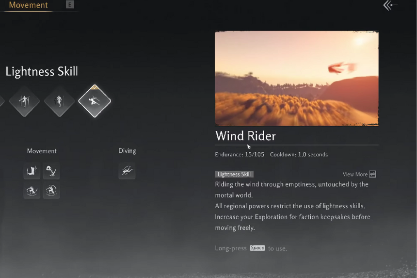 Most major factions limit Lightness skills, but as you raise your Exploration Level, you earn special keepsakes that let you use them freely. Wind Rider lets you ride the wind effortlessly, moving with a smooth, weightless flow.